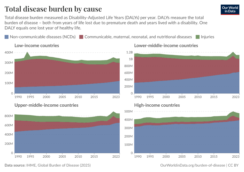 In low-income countries, communicable and neonatal diseases tend to rank much higher. This starkly contrasts with high-income countries, where communicable diseases may not be in the top ten, and instead, cardiovascular disease and cancers tend to contribute the largest burden.