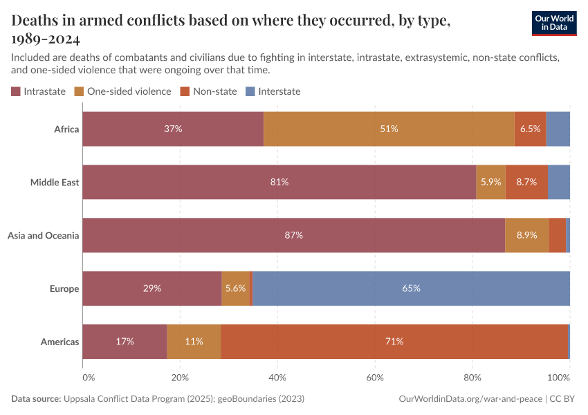 Bastian Herre (2024) - “Millions have died in conflicts since the Cold War; most of them in Africa and intrastate conflicts” Published online at OurWorldinData.org. Retrieved from: 'https://data-chartpreview-unify.owid.pages.dev:8789/20251125-173858/conflict-deaths-breakdown.html' [Online Resource] (archived on November 25, 2025).BibTeX citation