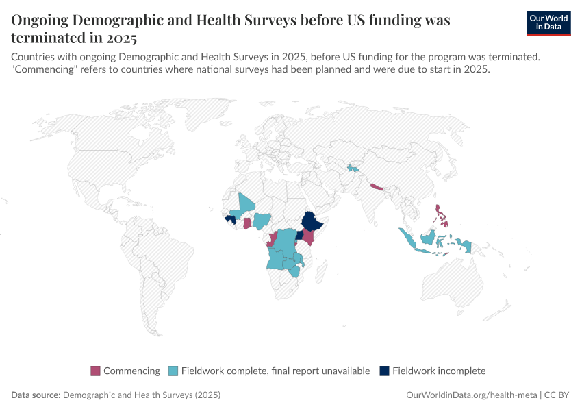 Saloni Dattani (2025) - “The Demographic and Health Surveys brought crucial data for more than 90 countries — without them, we risk darkness” Published online at OurWorldinData.org. Retrieved from: 'https://data-chartpreview-unify.owid.pages.dev:8789/20260226-063322/demographic-health-surveys-risk.html' [Online Resource] (archived on February 26, 2026).BibTeX citation