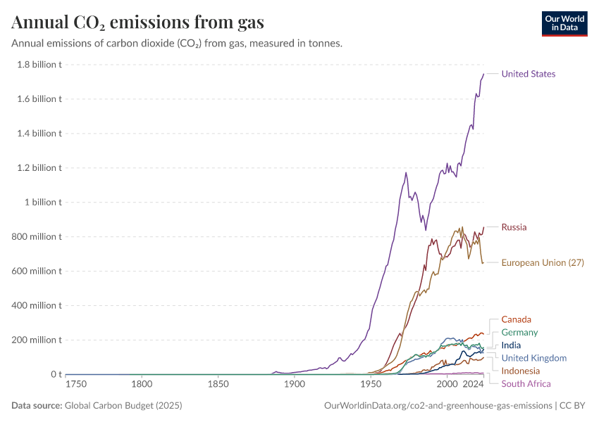 This interactive chart shows per capita CO2 emissions from gas, measured in tonnes per person per year.