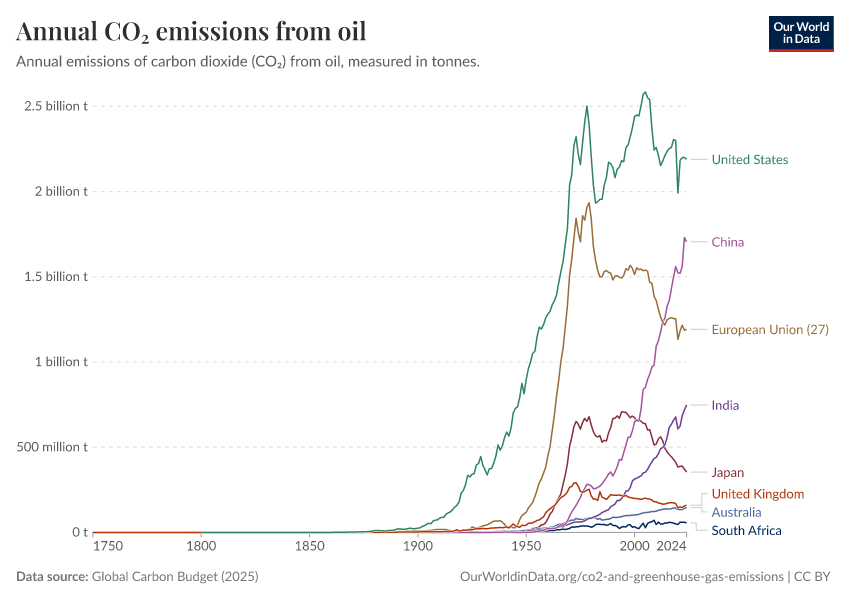 This interactive chart shows per capita CO2 emissions from oil, measured in tonnes per person per year.