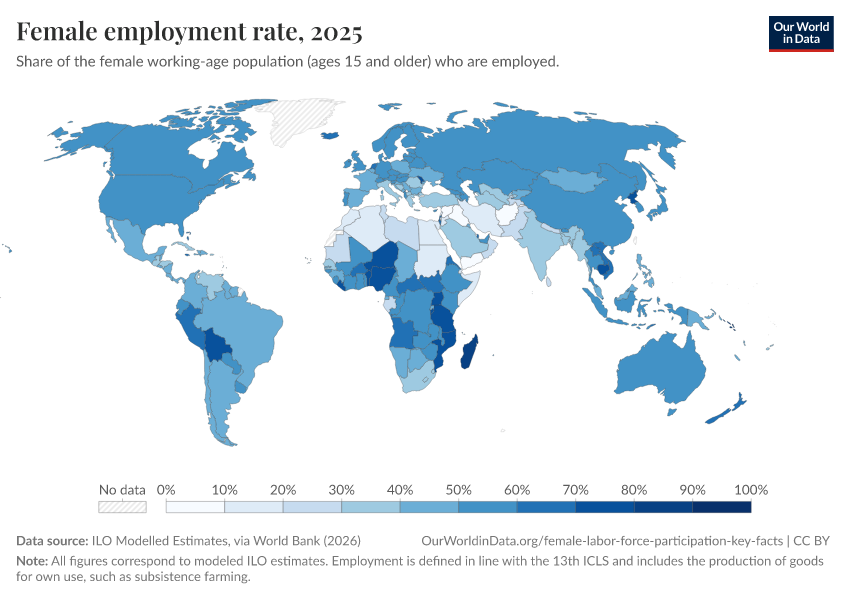 The chart shows that around half of all women worldwide are participating in the labor force. That is, they are of working age and “economically active”, either because they are working or actively looking for a job.