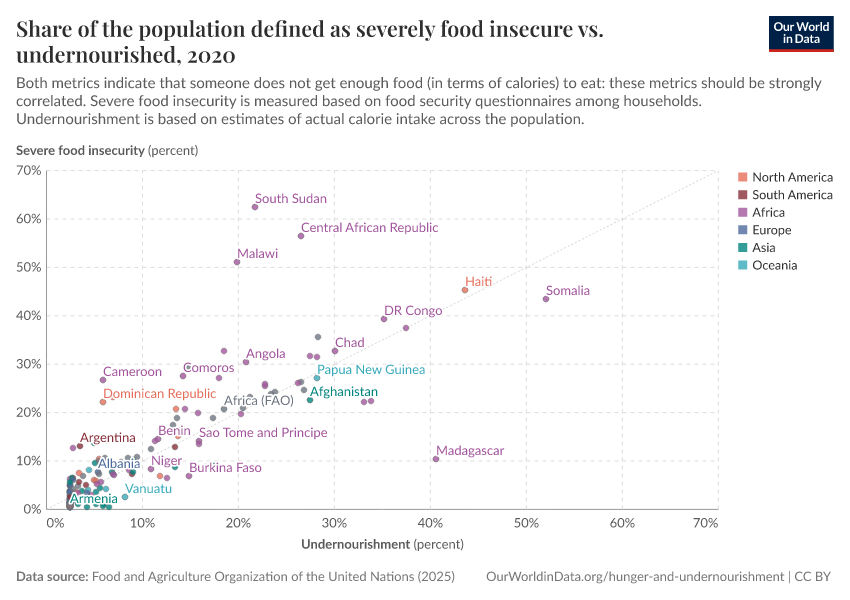 In the chart below we see the correlation between these two metrics: on the y-axis we have the prevalence of severe food insecurity, and on the x-axis we have the prevalence of undernourishment. If these estimates were identical, they’d lie along the diagonal gray line.