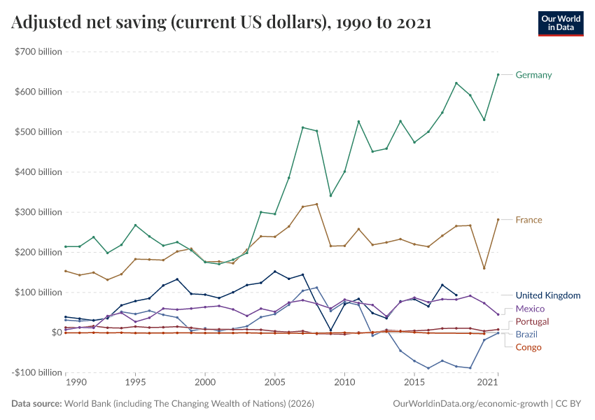 “Data Page: Adjusted net saving (current US dollars)”. Our World in Data (2026). Data adapted from World Bank (including The Changing Wealth of Nations). Retrieved from https://data-chartpreview-unify.owid.pages.dev:8789/20260202-181317/grapher/adjusted-net-saving-current-us-dollars.html [online resource] (archived on February 2, 2026).How to cite this data