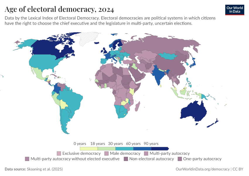 Skaaning et al. (2025) – processed by Our World in Data. “Age of electoral democracy” [dataset]. Skaaning et al., “Lexical Index of Electoral Democracy (LIED) v6.8” [original data]. Retrieved February 27, 2026 from https://data-chartpreview-unify.owid.pages.dev:8789/20260119-065148/grapher/age-of-electoral-democracy-lexical.html (archived on January 19, 2026).