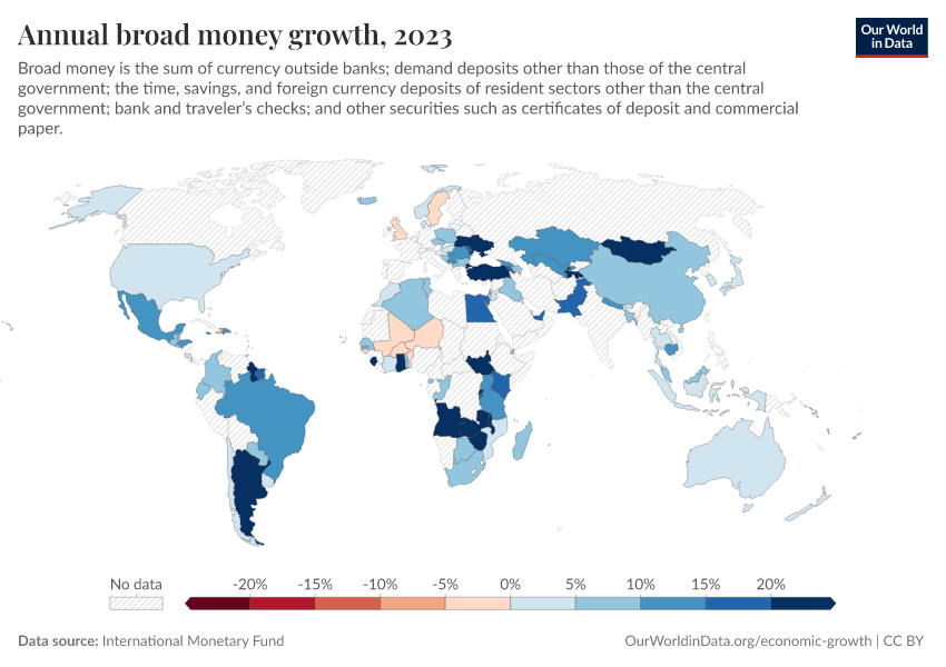 International Monetary Fund – processed by Our World in Data. “Annual broad money growth” [dataset]. International Monetary Fund, “International Monetary Fund, International Financial Statistics and data files.” [original data]. Retrieved February 27, 2026 from https://data-chartpreview-unify.owid.pages.dev:8789/20251120-211749/grapher/annual-broad-money-growth.html (archived on November 20, 2025).