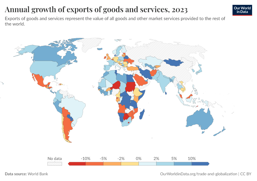 “Data Page: Annual growth of exports of goods and services”. Our World in Data (2026). Data adapted from World Bank. Retrieved from https://data-chartpreview-unify.owid.pages.dev:8789/20260130-180113/grapher/annual-growth-of-exports-of-goods-and-services.html [online resource] (archived on January 30, 2026).How to cite this data