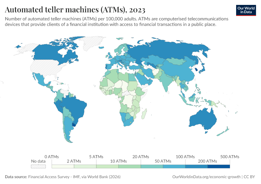 “Data Page: Automated teller machines (ATMs)”. Our World in Data (2026). Data adapted from Financial Access Survey - IMF, via World Bank. Retrieved from https://data-chartpreview-unify.owid.pages.dev:8789/20260202-181317/grapher/automated-teller-machines-atms-per-100000-adults.html [online resource] (archived on February 2, 2026).How to cite this data