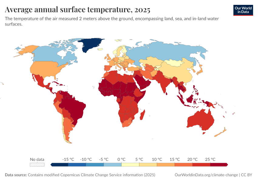 Contains modified Copernicus Climate Change Service information (2025) – with major processing by Our World in Data. “Average annual surface temperature” [dataset]. Contains modified Copernicus Climate Change Service information, “ERA5 monthly averaged data on single levels from 1940 to present 2” [original data]. Retrieved February 27, 2026 from https://data-chartpreview-unify.owid.pages.dev:8789/20260225-180245/grapher/average-annual-surface-temperature.html (archived on February 25, 2026).