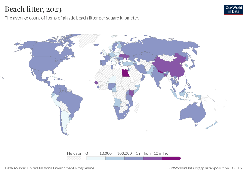 United Nations Environment Programme – processed by Our World in Data. “Beach litter” [dataset]. United Nations Environment Programme, “Data from multiple sources” [original data]. Retrieved February 27, 2026 from https://data-chartpreview-unify.owid.pages.dev:8789/20260105-133053/grapher/beach-litter.html (archived on January 5, 2026).