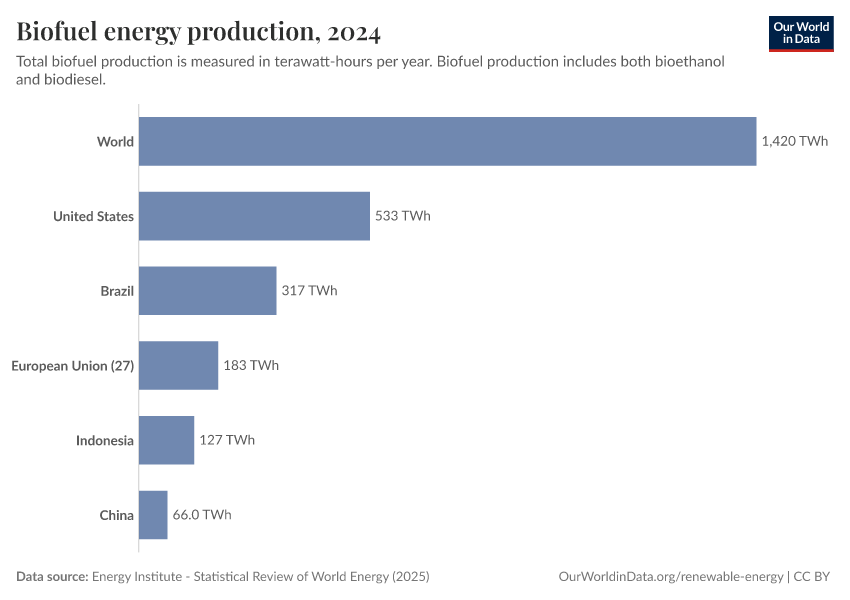 Energy Institute - Statistical Review of World Energy (2025) – with major processing by Our World in Data. “Biofuels production” [dataset]. Energy Institute, “Statistical Review of World Energy” [original data]. Retrieved February 27, 2026 from https://data-chartpreview-unify.owid.pages.dev:8789/20260119-065148/grapher/biofuel-production.html (archived on January 19, 2026).