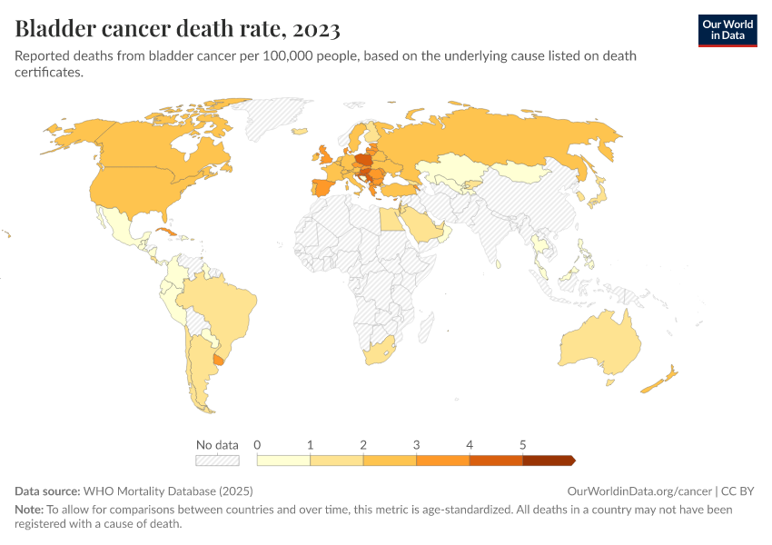 “Data Page: Bladder cancer death rate”, part of the following publication: Saloni Dattani, Fiona Spooner, Hannah Ritchie, and Max Roser (2023) - “Causes of Death”. Data adapted from WHO Mortality Database. Retrieved from https://data-chartpreview-unify.owid.pages.dev:8789/20250909-093708/grapher/bladder-cancer-death-rate.html [online resource] (archived on September 9, 2025).How to cite this data