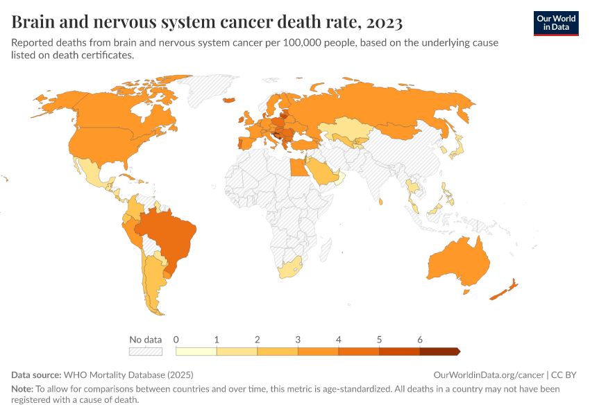 WHO Mortality Database (2025) – with minor processing by Our World in Data. “Brain and nervous system cancer death rate” [dataset]. WHO Mortality Database, “WHO Mortality Database” [original data]. Retrieved February 27, 2026 from https://data-chartpreview-unify.owid.pages.dev:8789/20250909-093708/grapher/brain-and-nervous-system-cancer-death-rate.html (archived on September 9, 2025).