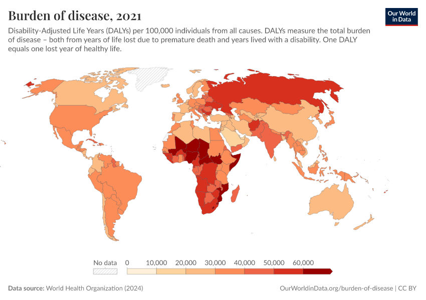 “Data Page: Burden of disease”, part of the following publication: Esteban Ortiz-Ospina and Max Roser (2016) - “Global Health”. Data adapted from World Health Organization. Retrieved from https://data-chartpreview-unify.owid.pages.dev:8789/20250909-093708/grapher/burden-of-disease-who.html [online resource] (archived on September 9, 2025).How to cite this data