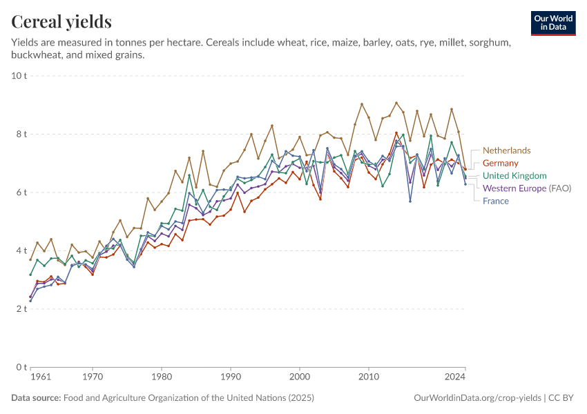 Food and Agriculture Organization of the United Nations (2025) – with major processing by Our World in Data. “Cereal yields – UN FAO” [dataset]. Food and Agriculture Organization of the United Nations, “Production: Crops and livestock products” [original data]. Retrieved February 27, 2026 from https://data-chartpreview-unify.owid.pages.dev:8789/20260116-143329/grapher/cereal-yield.html (archived on January 16, 2026).
