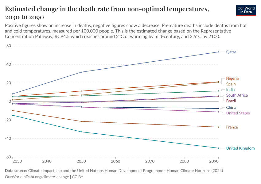 “Data Page: Estimated change in the death rate from non-optimal temperatures”. Our World in Data (2026). Data adapted from Climate Impact Lab and the United Nations Human Development Programme. Retrieved from https://data-chartpreview-unify.owid.pages.dev:8789/20250909-093708/grapher/change-heat-death-rate.html [online resource] (archived on September 9, 2025).How to cite this data