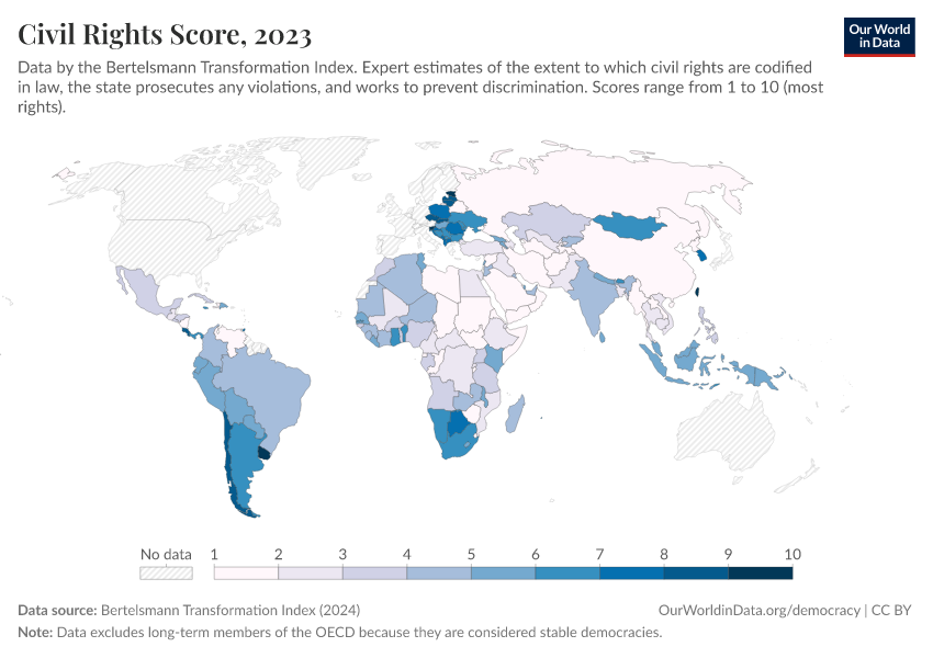 Bertelsmann Transformation Index (2024) – processed by Our World in Data. “Civil Rights Score” [dataset]. Bertelsmann Transformation Index, “Bertelsmann Transformation Index, Scores” [original data]. Retrieved February 27, 2026 from https://data-chartpreview-unify.owid.pages.dev:8789/20260204-165456/grapher/civil-rights-score-bti.html (archived on February 4, 2026).