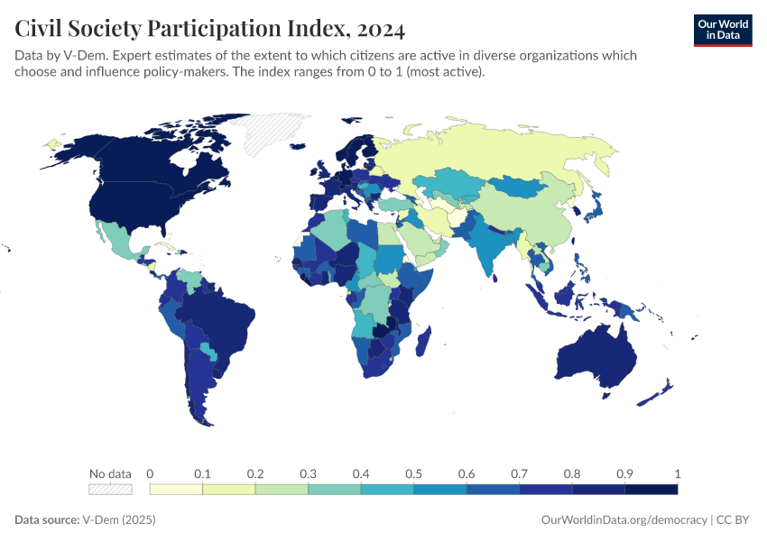 “Data Page: Civil society participation index”, part of the following publication: Bastian Herre, Lucas Rodés-Guirao, and Esteban Ortiz-Ospina (2013) - “Democracy”. Data adapted from V-Dem. Retrieved from https://data-chartpreview-unify.owid.pages.dev:8789/20260119-070102/grapher/civil-society-participation-index.html [online resource] (archived on January 19, 2026).How to cite this data