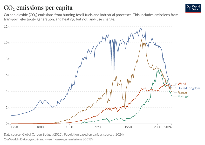 “Data Page: CO₂ emissions per capita”, part of the following publication: Hannah Ritchie, Pablo Rosado, and Max Roser (2023) - “CO₂ and Greenhouse Gas Emissions”. Data adapted from Global Carbon Project, Various sources. Retrieved from https://data-chartpreview-unify.owid.pages.dev:8789/20260119-070102/grapher/co-emissions-per-capita.html [online resource] (archived on January 19, 2026).How to cite this data