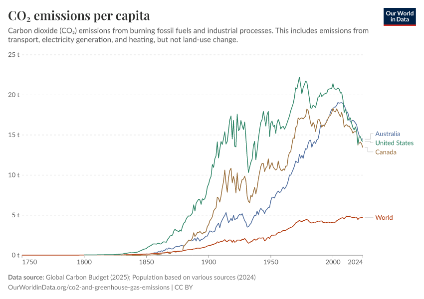 Global Carbon Budget (2025); Population based on various sources (2024) – with major processing by Our World in Data. “CO₂ emissions per capita” [dataset]. Global Carbon Project, “Global Carbon Budget v15”; Various sources, “Population” [original data]. Retrieved February 27, 2026 from https://data-chartpreview-unify.owid.pages.dev:8789/20260119-070102/grapher/co-emissions-per-capita.html (archived on January 19, 2026).
