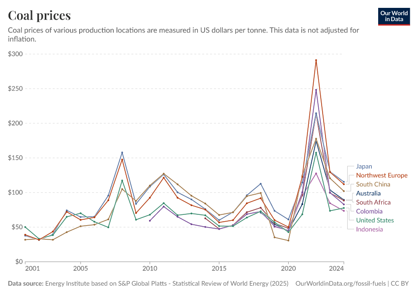 Energy Institute based on S&P Global Platts - Statistical Review of World Energy (2025) – with major processing by Our World in Data. “Coal prices” [dataset]. Energy Institute, “Statistical Review of World Energy” [original data]. Retrieved February 27, 2026 from https://data-chartpreview-unify.owid.pages.dev:8789/20250909-093708/grapher/coal-prices.html (archived on September 9, 2025).