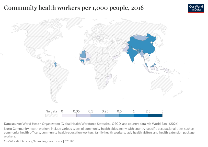 “Data Page: Community health workers per 1,000 people”. Our World in Data (2026). Data adapted from World Health Organization (Global Health Workforce Statistics), OECD, and country data, via World Bank. Retrieved from https://data-chartpreview-unify.owid.pages.dev:8789/20260202-181317/grapher/community-health-workers.html [online resource] (archived on February 2, 2026).How to cite this data