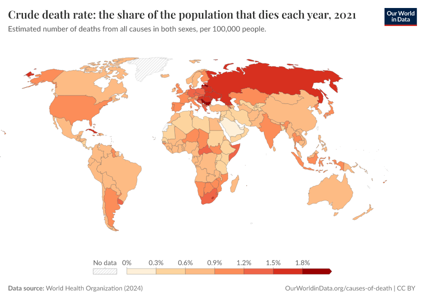 World Health Organization (2024) – with major processing by Our World in Data. “Crude death rate: the share of the population that dies each year” [dataset]. World Health Organization, “Global Health Estimates” [original data]. Retrieved February 27, 2026 from https://data-chartpreview-unify.owid.pages.dev:8789/20250909-093708/grapher/crude-death-rate-the-share-of-the-population-that-dies-each-year-who.html (archived on September 9, 2025).