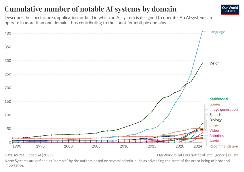 Epoch AI (2025) – with major processing by Our World in Data. “Cumulative number of notable AI systems by domain” [dataset]. Epoch AI, “Parameter, Compute and Data Trends in Machine Learning” [original data]. Retrieved February 27, 2026 from https://data-chartpreview-unify.owid.pages.dev:8789/20260126-094752/grapher/cumulative-number-of-notable-ai-systems-by-domain.html (archived on January 26, 2026).