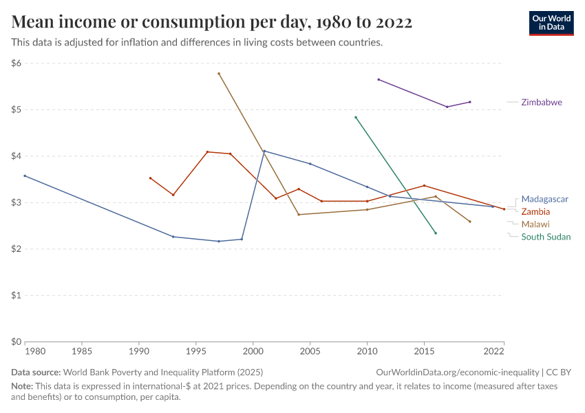 World Bank Poverty and Inequality Platform (2025) – with major processing by Our World in Data. “Mean income or consumption per day – World Bank” [dataset]. World Bank Poverty and Inequality Platform, “World Bank Poverty and Inequality Platform (PIP) 20250930_2021, 20250930_2017” [original data]. Retrieved February 27, 2026 from https://data-chartpreview-unify.owid.pages.dev:8789/20260127-114142/grapher/daily-mean-income.html (archived on January 27, 2026).