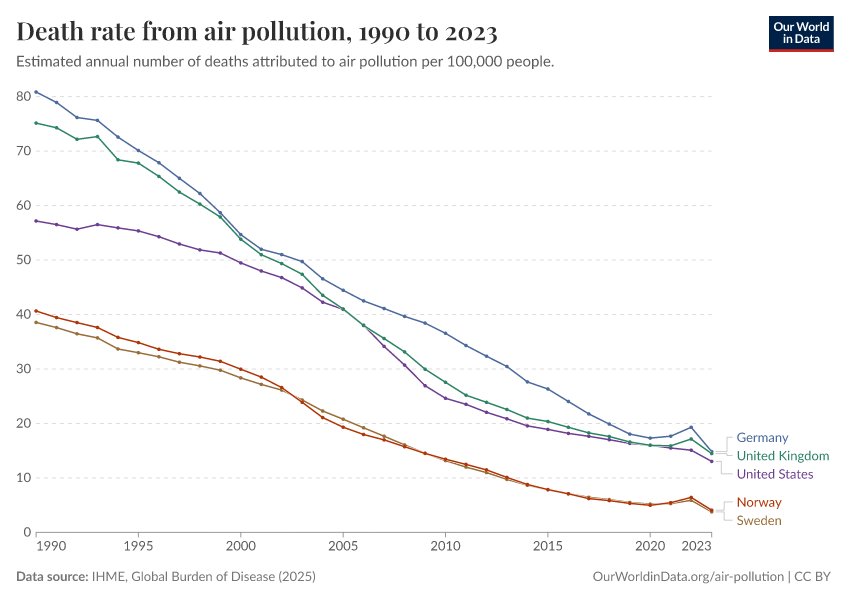 IHME, Global Burden of Disease (2025) – with major processing by Our World in Data. “Death rate from air pollution” [dataset]. IHME, Global Burden of Disease, “Global Burden of Disease - Risk Factors - Deaths” [original data]. Retrieved February 27, 2026 from https://data-chartpreview-unify.owid.pages.dev:8789/20260213-112438/grapher/death-rate-from-air-pollution-per-100000.html (archived on February 13, 2026).