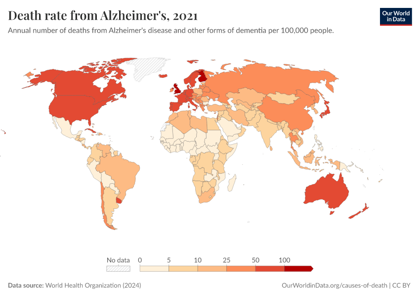 World Health Organization (2024) – with major processing by Our World in Data. “Death rate from Alzheimer's” [dataset]. World Health Organization, “Global Health Estimates” [original data]. Retrieved February 27, 2026 from https://data-chartpreview-unify.owid.pages.dev:8789/20250909-093708/grapher/death-rate-from-alzheimers-other-dementias-ghe.html (archived on September 9, 2025).