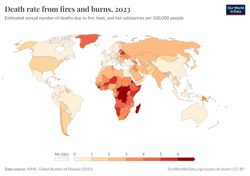 IHME, Global Burden of Disease (2025) – with major processing by Our World in Data. “Death rate from fires and burns” [dataset]. IHME, Global Burden of Disease, “Global Burden of Disease - Deaths” [original data]. Retrieved February 27, 2026 from https://data-chartpreview-unify.owid.pages.dev:8789/20260211-174736/grapher/death-rate-from-fires-and-burns-ihme.html (archived on February 11, 2026).