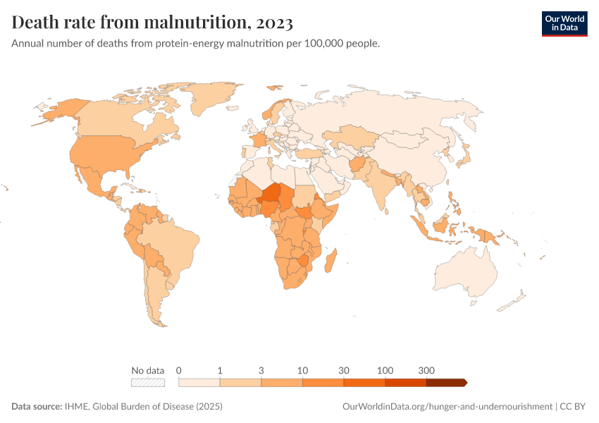 IHME, Global Burden of Disease (2025) – with major processing by Our World in Data. “Death rate from malnutrition” [dataset]. IHME, Global Burden of Disease, “Global Burden of Disease - Deaths” [original data]. Retrieved February 27, 2026 from https://data-chartpreview-unify.owid.pages.dev:8789/20260211-174736/grapher/death-rate-from-malnutrition.html (archived on February 11, 2026).