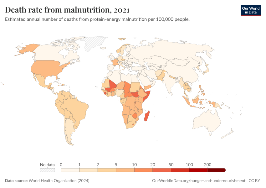 World Health Organization (2024) – with major processing by Our World in Data. “Death rate from malnutrition” [dataset]. World Health Organization, “Global Health Estimates” [original data]. Retrieved February 27, 2026 from https://data-chartpreview-unify.owid.pages.dev:8789/20250909-093708/grapher/death-rate-from-malnutrition-ghe.html (archived on September 9, 2025).