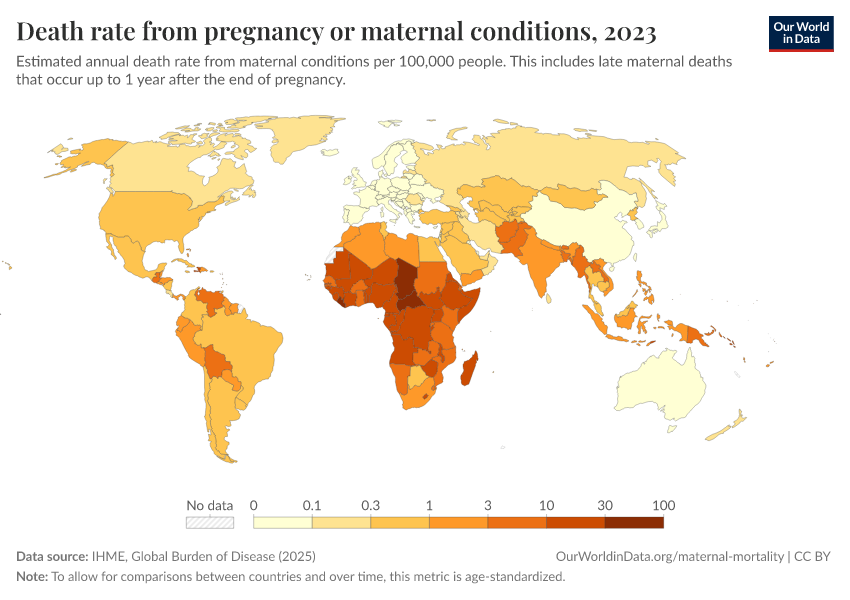 IHME, Global Burden of Disease (2025) – with major processing by Our World in Data. “Death rate from pregnancy or maternal conditions” [dataset]. IHME, Global Burden of Disease, “Global Burden of Disease - Deaths” [original data]. Retrieved February 27, 2026 from https://data-chartpreview-unify.owid.pages.dev:8789/20260211-174736/grapher/death-rate-from-maternal-disorders-ihme.html (archived on February 11, 2026).