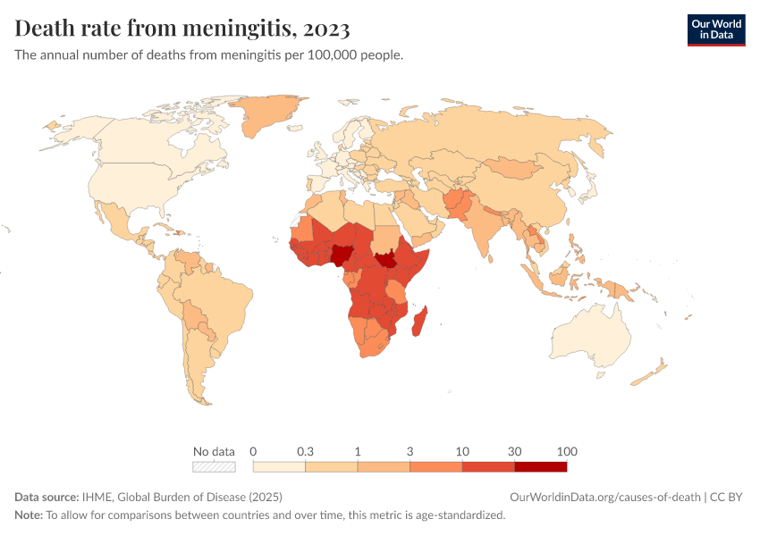 IHME, Global Burden of Disease (2025) – with major processing by Our World in Data. “Death rate from meningitis” [dataset]. IHME, Global Burden of Disease, “Global Burden of Disease - Deaths” [original data]. Retrieved February 27, 2026 from https://data-chartpreview-unify.owid.pages.dev:8789/20260211-174736/grapher/death-rate-from-meningitis.html (archived on February 11, 2026).
