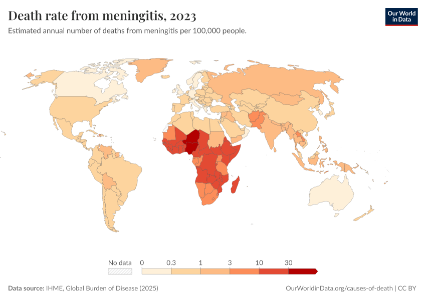 “Data Page: Death rate from meningitis”, part of the following publication: Esteban Ortiz-Ospina and Max Roser (2016) - “Global Health”. Data adapted from IHME, Global Burden of Disease. Retrieved from https://data-chartpreview-unify.owid.pages.dev:8789/20260211-174736/grapher/death-rate-from-meningitis-gbd.html [online resource] (archived on February 11, 2026).How to cite this data