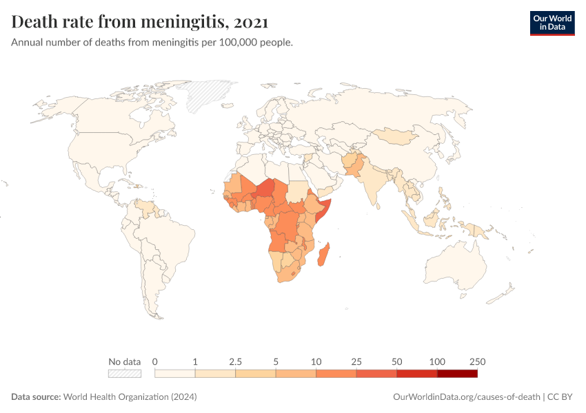 “Data Page: Death rate from meningitis”, part of the following publication: Esteban Ortiz-Ospina and Max Roser (2016) - “Global Health”. Data adapted from World Health Organization. Retrieved from https://data-chartpreview-unify.owid.pages.dev:8789/20250909-093708/grapher/death-rate-from-meningitis-who.html [online resource] (archived on September 9, 2025).How to cite this data