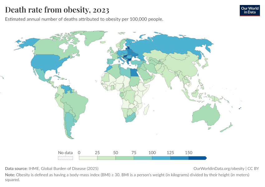 IHME, Global Burden of Disease (2025) – with major processing by Our World in Data. “Death rate from obesity” [dataset]. IHME, Global Burden of Disease, “Global Burden of Disease - Risk Factors - Deaths” [original data]. Retrieved February 27, 2026 from https://data-chartpreview-unify.owid.pages.dev:8789/20260213-112438/grapher/death-rate-from-obesity-gbd.html (archived on February 13, 2026).