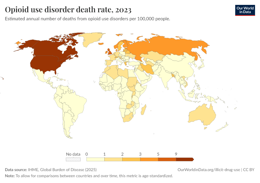 IHME, Global Burden of Disease (2025) – with major processing by Our World in Data. “Opioid use disorder death rate” [dataset]. IHME, Global Burden of Disease, “Global Burden of Disease - Deaths” [original data]. Retrieved February 27, 2026 from https://data-chartpreview-unify.owid.pages.dev:8789/20260211-174736/grapher/death-rate-from-opioid-use.html (archived on February 11, 2026).
