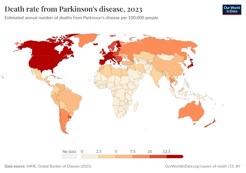 IHME, Global Burden of Disease (2025) – with major processing by Our World in Data. “Death rate from Parkinson's disease” [dataset]. IHME, Global Burden of Disease, “Global Burden of Disease - Deaths” [original data]. Retrieved February 27, 2026 from https://data-chartpreview-unify.owid.pages.dev:8789/20260211-174736/grapher/death-rate-from-parkinsons-disease-gbd.html (archived on February 11, 2026).