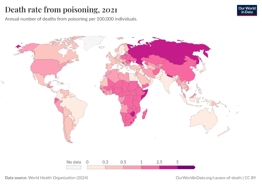 World Health Organization (2024) – with major processing by Our World in Data. “Death rate from poisoning” [dataset]. World Health Organization, “Global Health Estimates” [original data]. Retrieved February 27, 2026 from https://data-chartpreview-unify.owid.pages.dev:8789/20250909-093708/grapher/death-rate-from-poisoning-ghe.html (archived on September 9, 2025).
