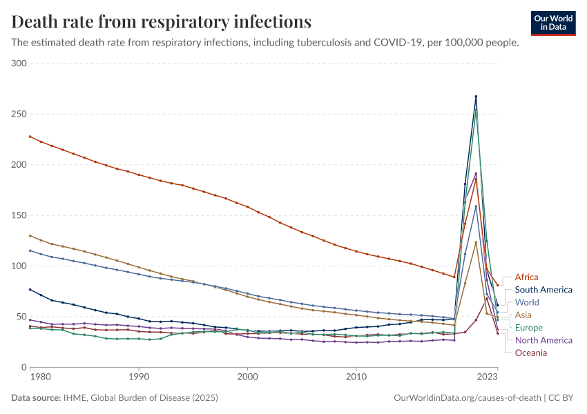 IHME, Global Burden of Disease (2025) – with major processing by Our World in Data. “Death rate from respiratory infections” [dataset]. IHME, Global Burden of Disease, “Global Burden of Disease - Deaths” [original data]. Retrieved February 27, 2026 from https://data-chartpreview-unify.owid.pages.dev:8789/20260211-174736/grapher/death-rate-from-respiratory-infections-gbd.html (archived on February 11, 2026).