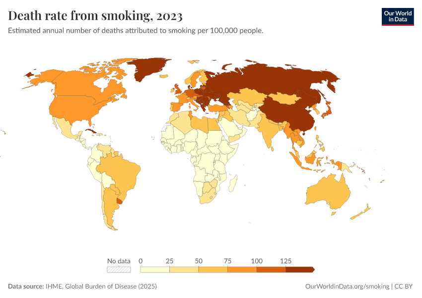 IHME, Global Burden of Disease (2025) – with major processing by Our World in Data. “Death rate from smoking” [dataset]. IHME, Global Burden of Disease, “Global Burden of Disease - Risk Factors - Deaths” [original data]. Retrieved February 27, 2026 from https://data-chartpreview-unify.owid.pages.dev:8789/20260213-113303/grapher/death-rate-from-smoking.html (archived on February 13, 2026).