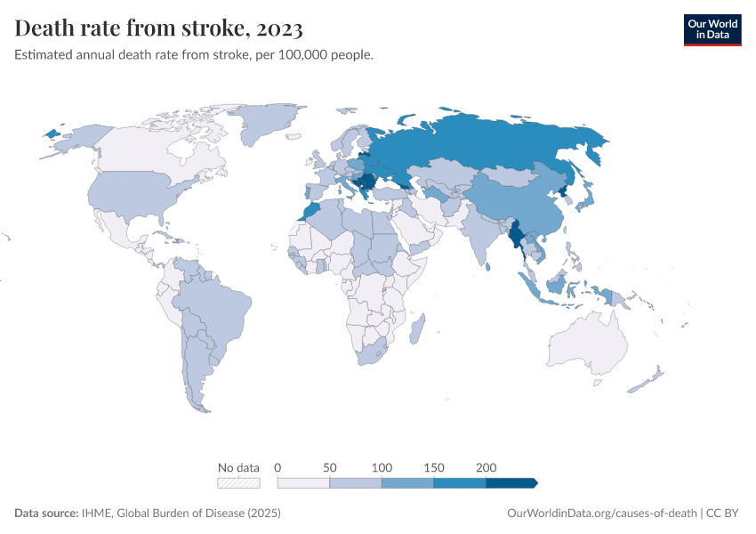IHME, Global Burden of Disease (2025) – with major processing by Our World in Data. “Death rate from stroke” [dataset]. IHME, Global Burden of Disease, “Global Burden of Disease - Deaths” [original data]. Retrieved February 27, 2026 from https://data-chartpreview-unify.owid.pages.dev:8789/20260211-174736/grapher/death-rate-from-strokes.html (archived on February 11, 2026).
