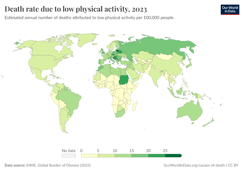 “Data Page: Death rate due to low physical activity”, part of the following publication: Esteban Ortiz-Ospina and Max Roser (2016) - “Global Health”. Data adapted from IHME, Global Burden of Disease. Retrieved from https://data-chartpreview-unify.owid.pages.dev:8789/20260213-112438/grapher/death-rates-due-to-low-physical-activity-gbd.html [online resource] (archived on February 13, 2026).How to cite this data