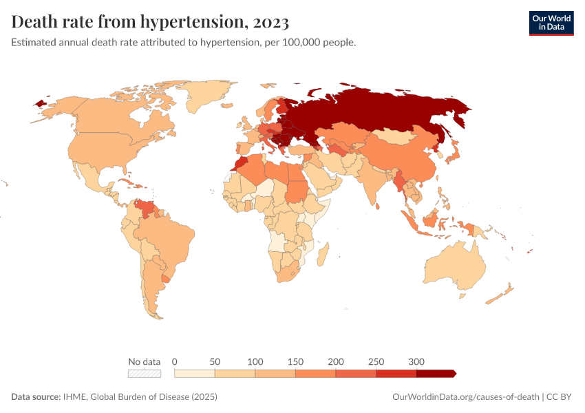 IHME, Global Burden of Disease (2025) – with major processing by Our World in Data. “Death rate from hypertension” [dataset]. IHME, Global Burden of Disease, “Global Burden of Disease - Risk Factors - Deaths” [original data]. Retrieved February 27, 2026 from https://data-chartpreview-unify.owid.pages.dev:8789/20260213-112438/grapher/death-rates-from-high-blood-pressure-gbd.html (archived on February 13, 2026).