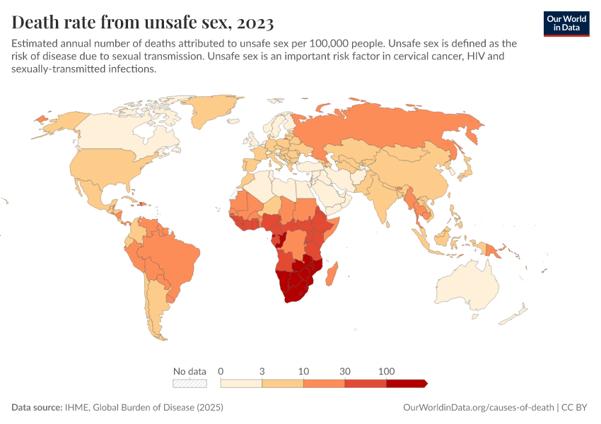“Data Page: Death rate from unsafe sex”, part of the following publication: Esteban Ortiz-Ospina and Max Roser (2016) - “Global Health”. Data adapted from IHME, Global Burden of Disease. Retrieved from https://data-chartpreview-unify.owid.pages.dev:8789/20260213-113303/grapher/death-rates-from-unsafe-sex-gbd.html [online resource] (archived on February 13, 2026).How to cite this data