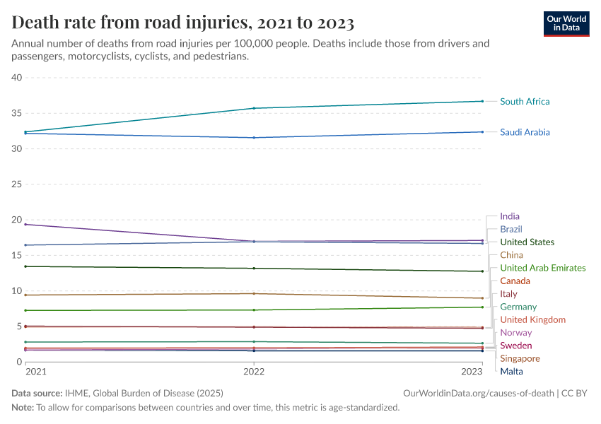 IHME, Global Burden of Disease (2025) – with major processing by Our World in Data. “Death rate from road injuries” [dataset]. IHME, Global Burden of Disease, “Global Burden of Disease - Deaths” [original data]. Retrieved February 27, 2026 from https://data-chartpreview-unify.owid.pages.dev:8789/20260211-173942/grapher/death-rates-road-incidents.html (archived on February 11, 2026).