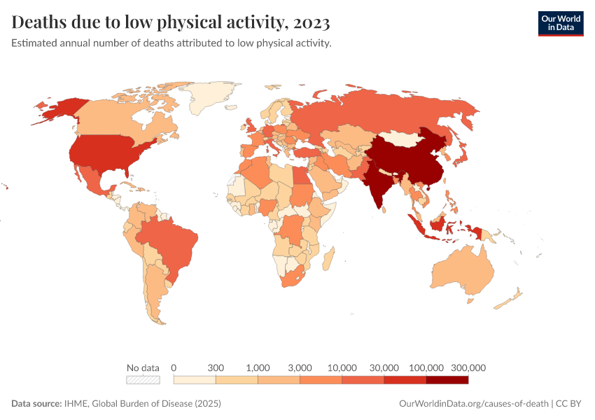 “Data Page: Deaths due to low physical activity”, part of the following publication: Esteban Ortiz-Ospina and Max Roser (2016) - “Global Health”. Data adapted from IHME, Global Burden of Disease. Retrieved from https://data-chartpreview-unify.owid.pages.dev:8789/20260213-112438/grapher/deaths-due-to-low-physical-activity.html [online resource] (archived on February 13, 2026).How to cite this data